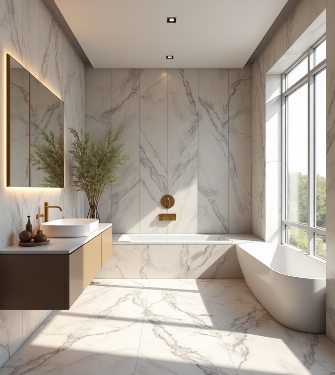 • الحمام الفندقي الفاخر: بورسلين رخامي 60×120، فواصل ذهبية أو فضية، إضاءة جدارية خلف المرآة — الخيار الأول لسكان مارينا دبي والريم أبوظبي. تحصل على شعور خمس نجوم في منزلك